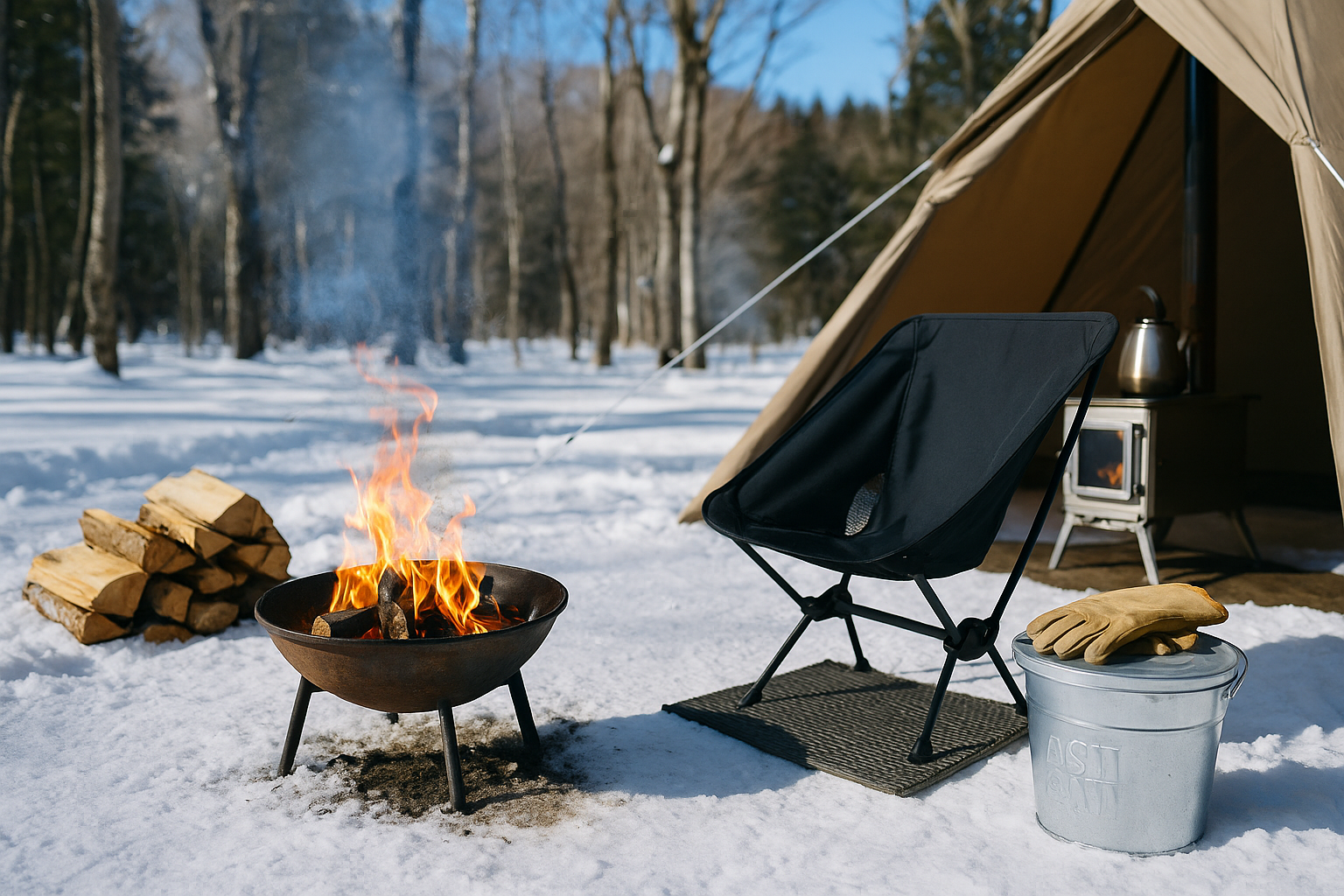 ・座面下にクローズドセルマットを1枚敷くだけで底冷えが強烈に減る=超コスパ。 - 火まわり:焚き火台/火ばさみ/耐熱グローブ/火消壺/消火用の水 or 砂/火消しフタ。